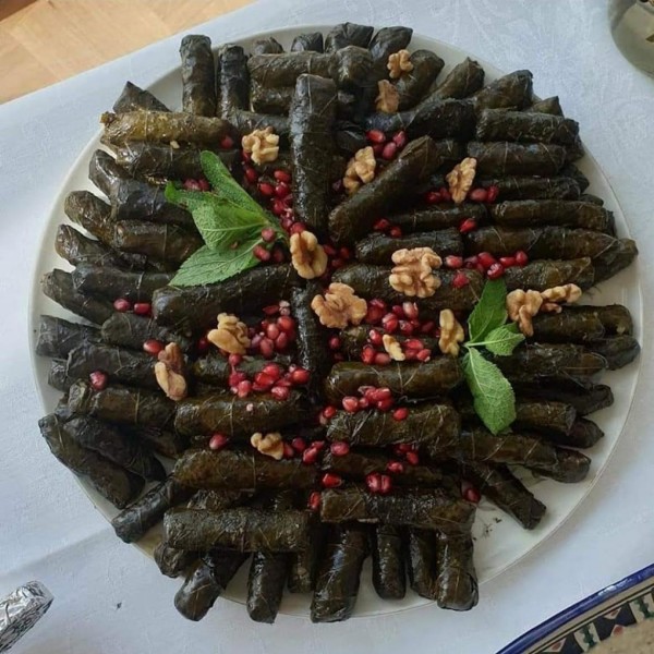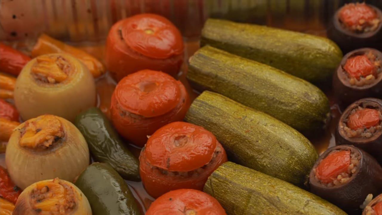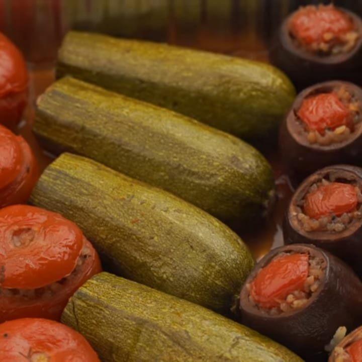 Auberginen oder Zucchini, Paprika, Weinblätter, Kartoffeln, gefüllt mit Reis, Gemüse, Tomaten- und Granatapfelsoße sowie Gewürzen