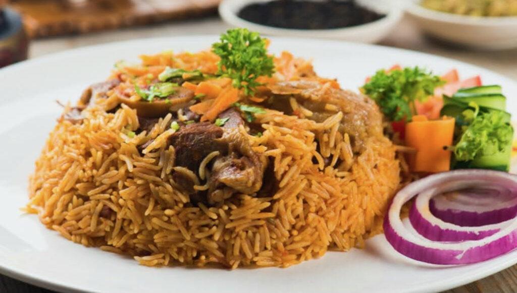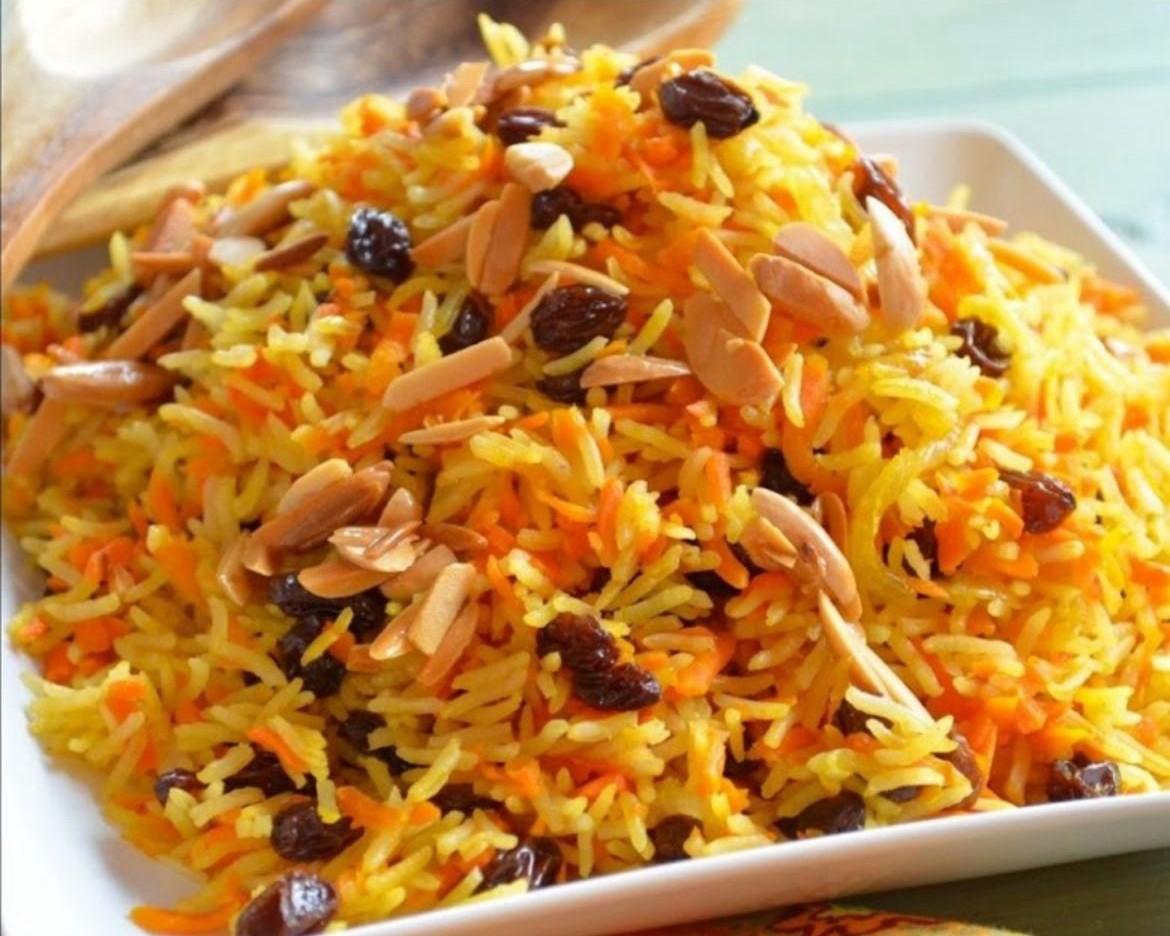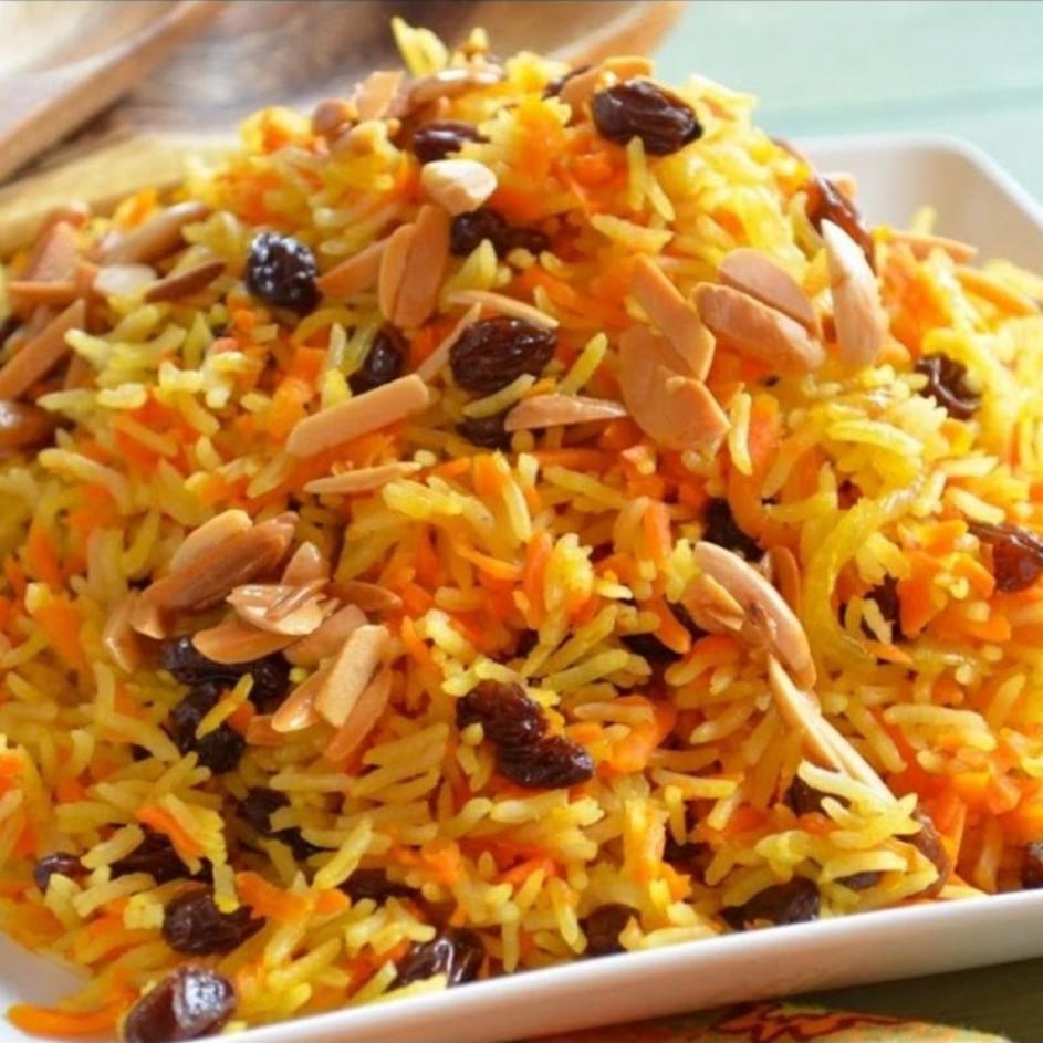 Reis, Hähnchen-, Kalb- oder Lammfleisch mit gebratenen Mandeln und Rosinen