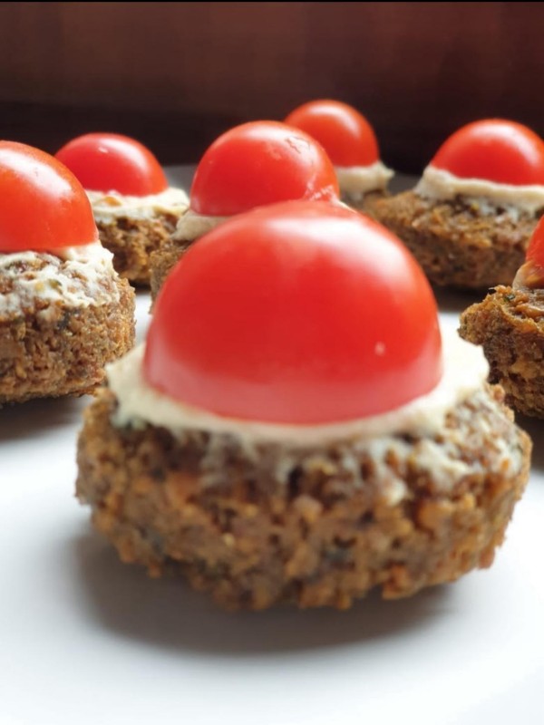 frittierte Kichererbsen, Petersilie, Zwiebeln, garniert mit Humus und Tomaten oder Granatapfel
